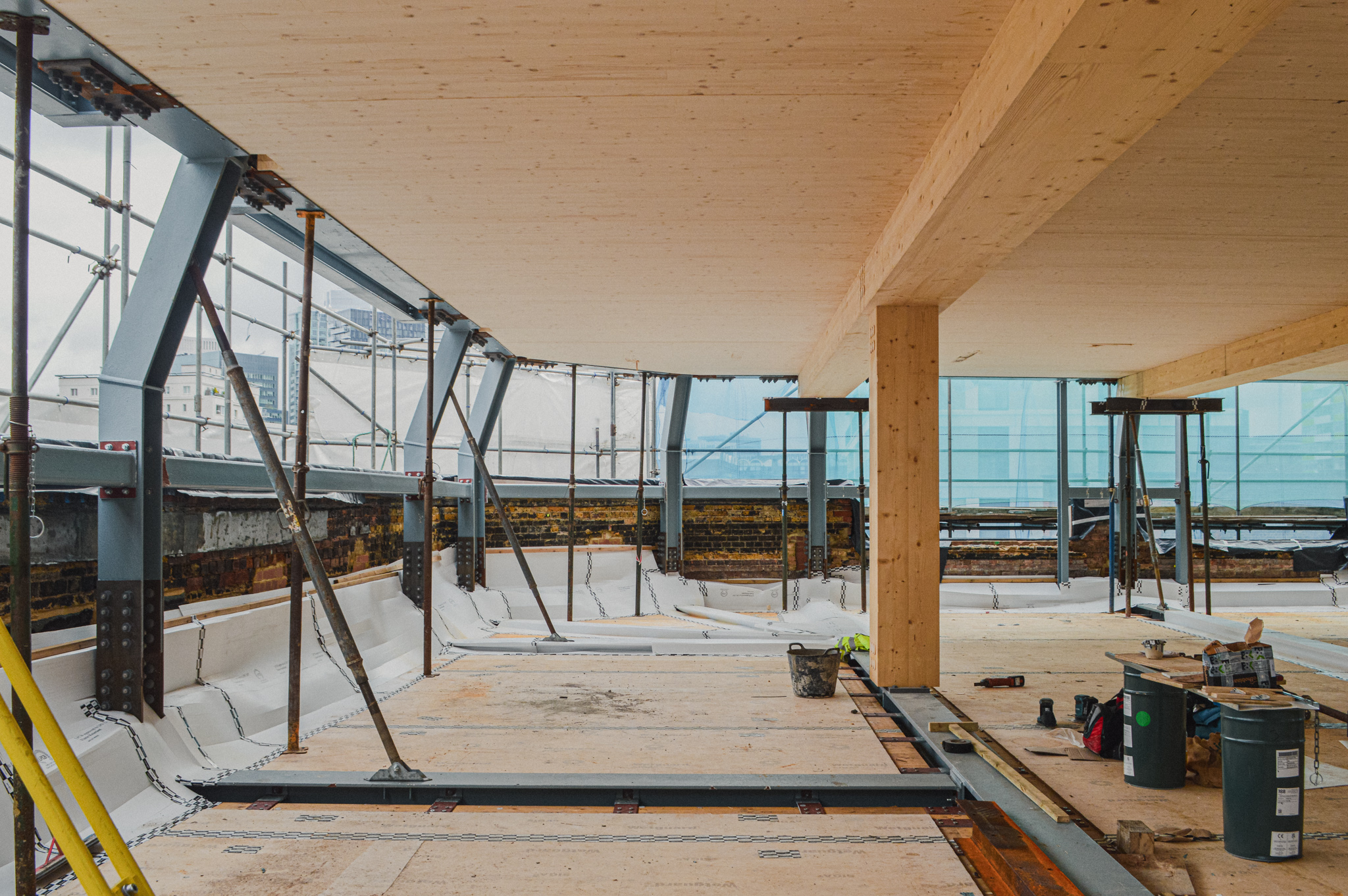 Current ongoing works include the refurbishment of the lower ground floors, the removal of the existing mansard roof and the installation of the Glulam beams and columns and the CLT slabs.