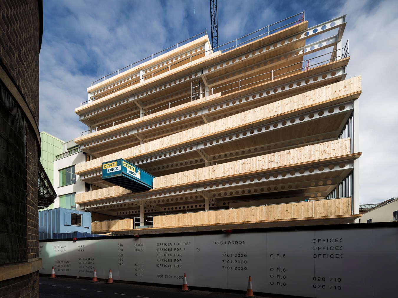 This six storey cross laminated timber hybrid office explores the principles of reduce, reuse and recycle. This innovative hybrid structure combines CLT and steel to maximise spans and minimise the number of internal columns, providing 34,000 sq. ft of office space with a completely flexible interior; and makes an iconic addition to the Regents Canal skyline.