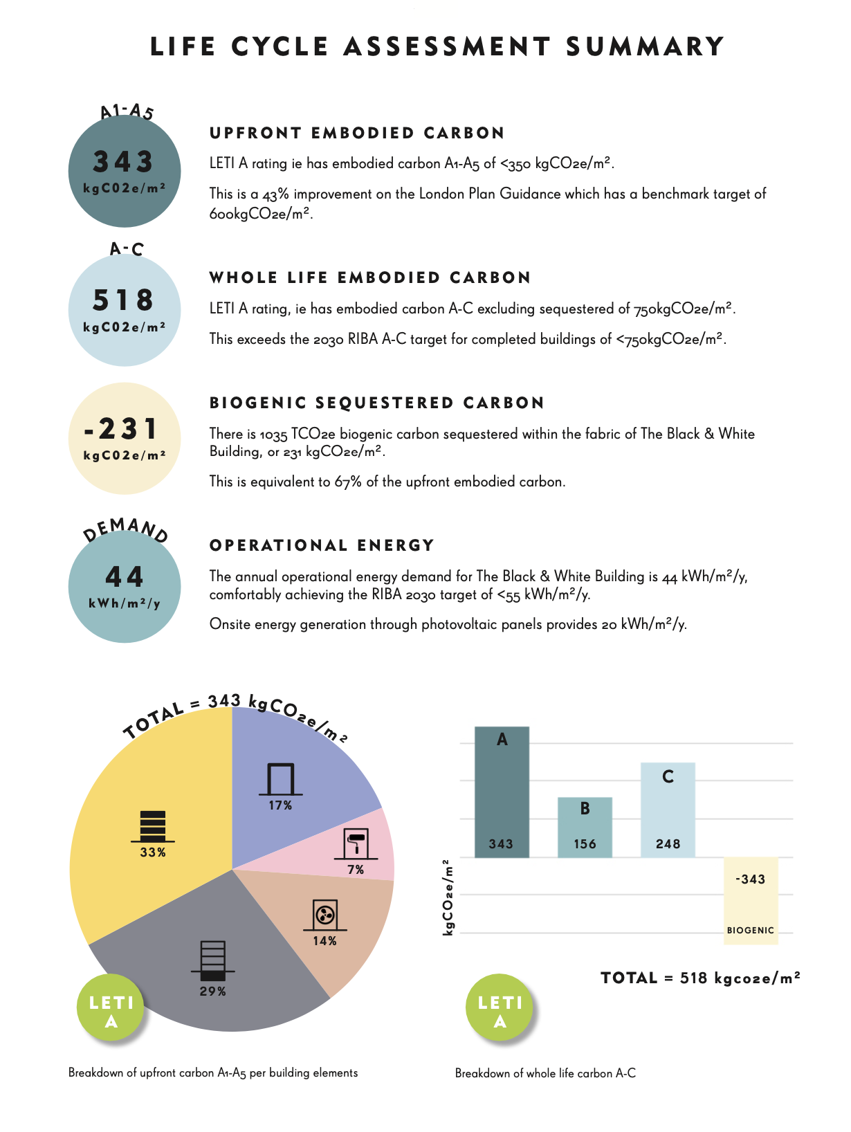 As part of our design methodology for The Black and White Building, we have produced a Life Cycle Assessment (LCA) to accurately quantify the whole life carbon outputs of our building.