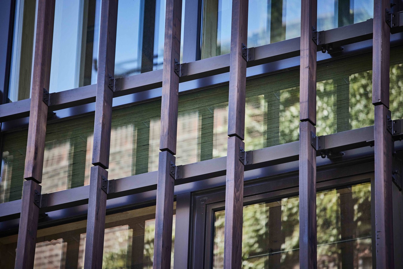 The state of the art timber structure is framed by the glazed curtain wall, with solar shading provided by a second skin of vertical timber louvres. A parametric model simulating the movement and impact of sun against the façade determines the layout and form of the louvres, demonstrating how timber, combined with cutting edge digital analysis of environmental performance, can result in a truly 21st century building.