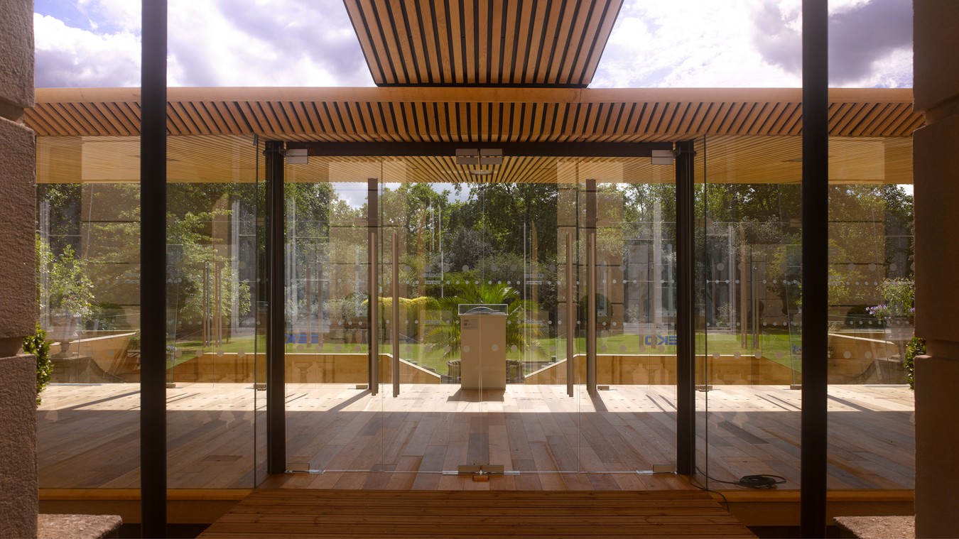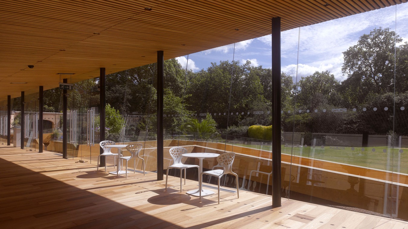 Designed to complement the classical façades of the Grade I listed Lancaster House, the space was enclosed on all sides by a continuous glass wall free from visible support structures. The roof sloped back towards Lancaster House, opening up to views of the garden, whilst the south elevation glazing angled forward to reduce reflections, making a seamless connection between inside and out.