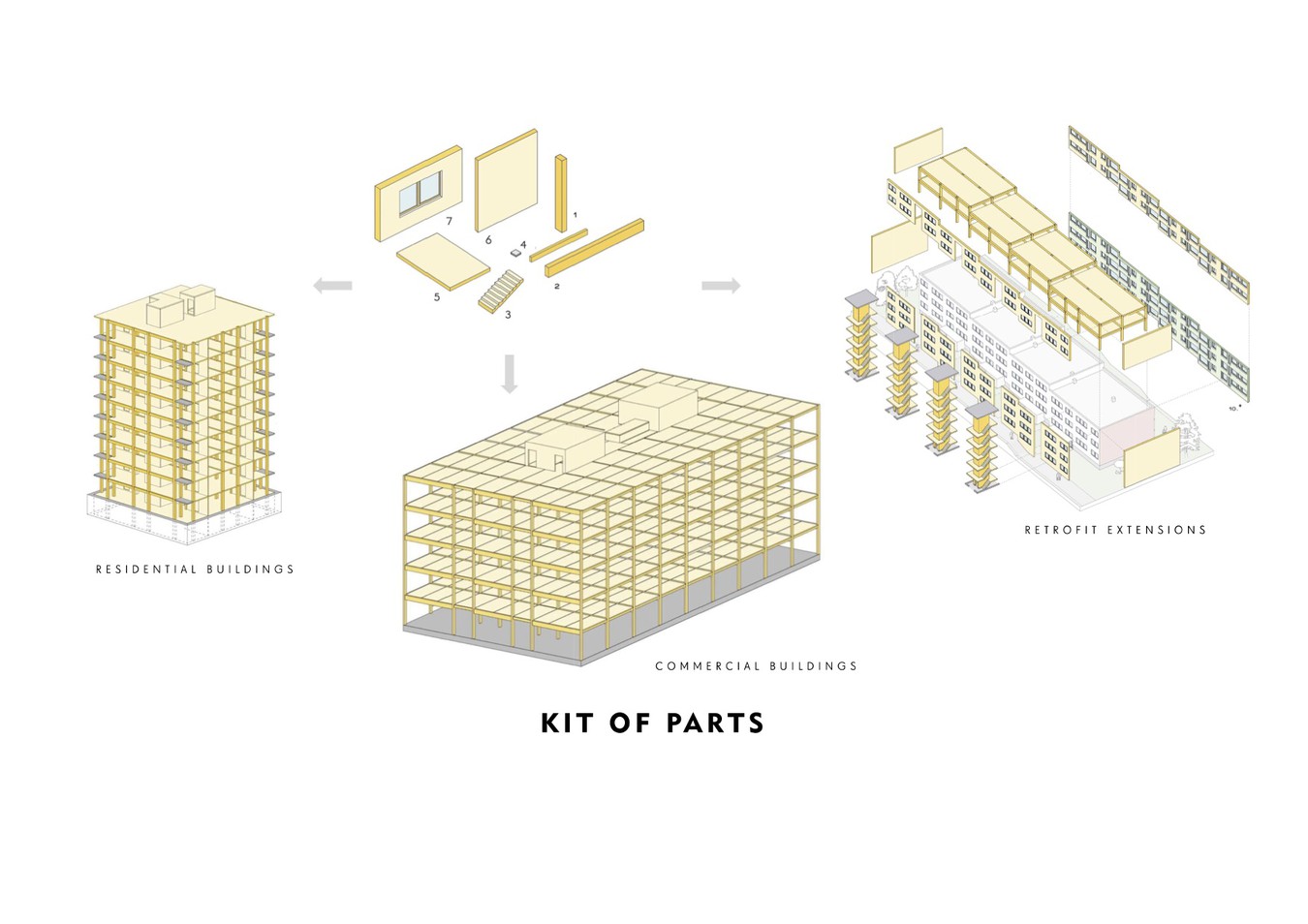 Our Build-in-Wood prototype is based on three pillars: designing for disassembly; the development of open-source design guides; and the dissemination and communication of these materials to industry stakeholders. Our applied research will contribute to a dynamic Design Guide, giving stakeholders an invaluable risk-reduction tool with complete information and certainty of technical, environmental, and economic aspects of these new mass timber building systems. This will act as a resource to encourage and ease the transition to a timber-first construction economy.