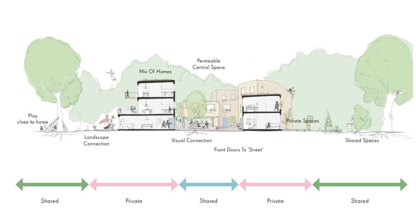Through these workshops, we envisioned a space that promoted multigenerational integration, where adults and children can interact and assist each other in day to day activities. With this in mind, all the homes have been designed around key communal spaces, rather than streets, oriented around seating areas and open space where children can play. Rear gardens are open to the beautiful woodland beyond so children can walk and play freely in the surrounding nature, with carparks located at the edge of the site to ensure the safety of the communal areas.