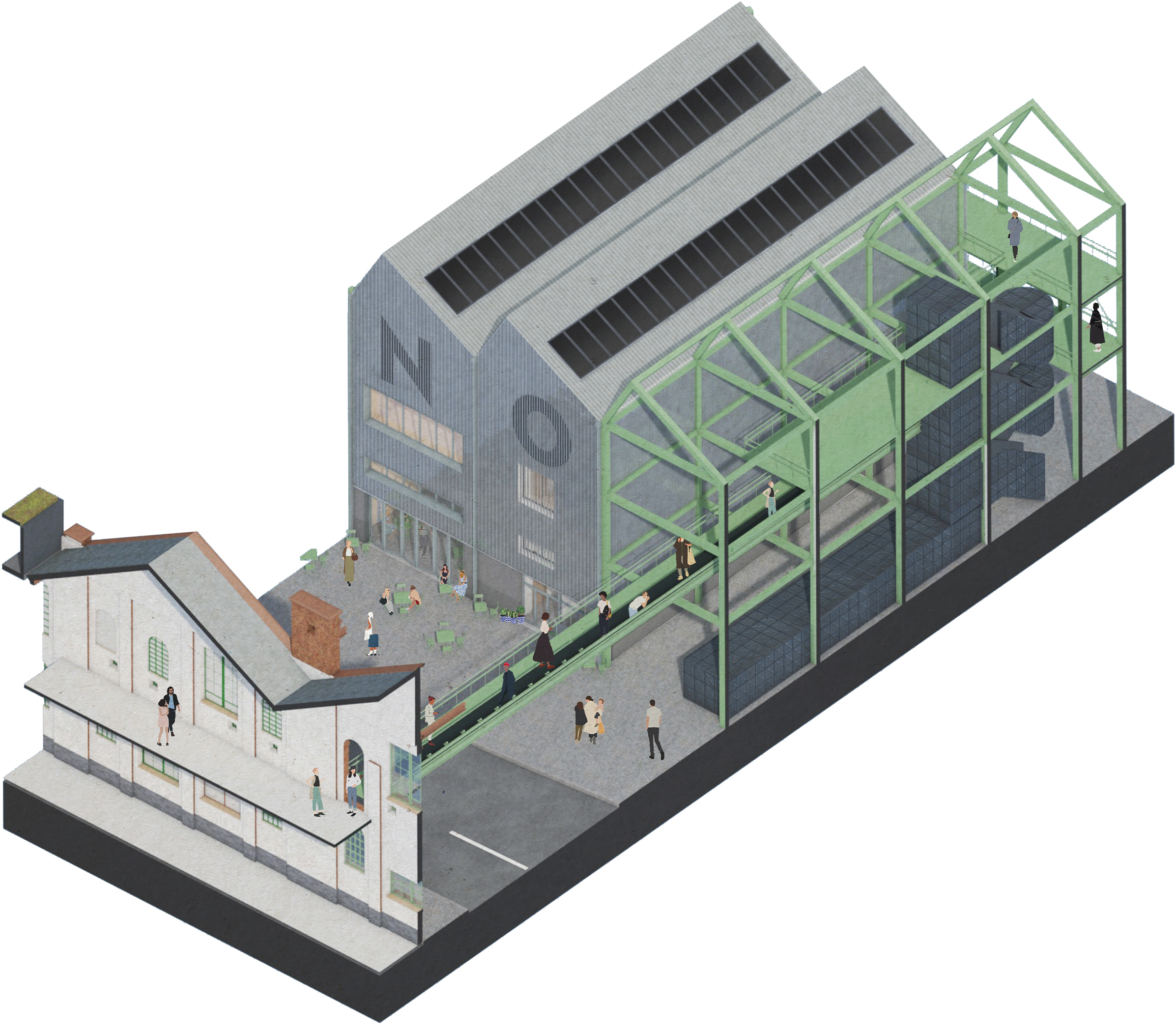 The familiar rhythm of pitched roofs was developed in close collaboration with Heritage England and the local planning authority with further consultation with Design Yorkshire and the Victorian Society to ensure a sympathetic reinstatement of the historic dense streetscape lost over the past few decades whilst deferring to the important Ice Factory building. Further integration with the historic fabric is seen in the overhead conveyor connection between the Ice Factory and the new buildings, with the potential to include the reinstatement of the listed conveyors taken down and set aside in the past. This language is extended across the new industrial buildings, reimagining the movement of ice as the movement of people, back and forth from their workplaces on new ‘conveyor’ gantries.