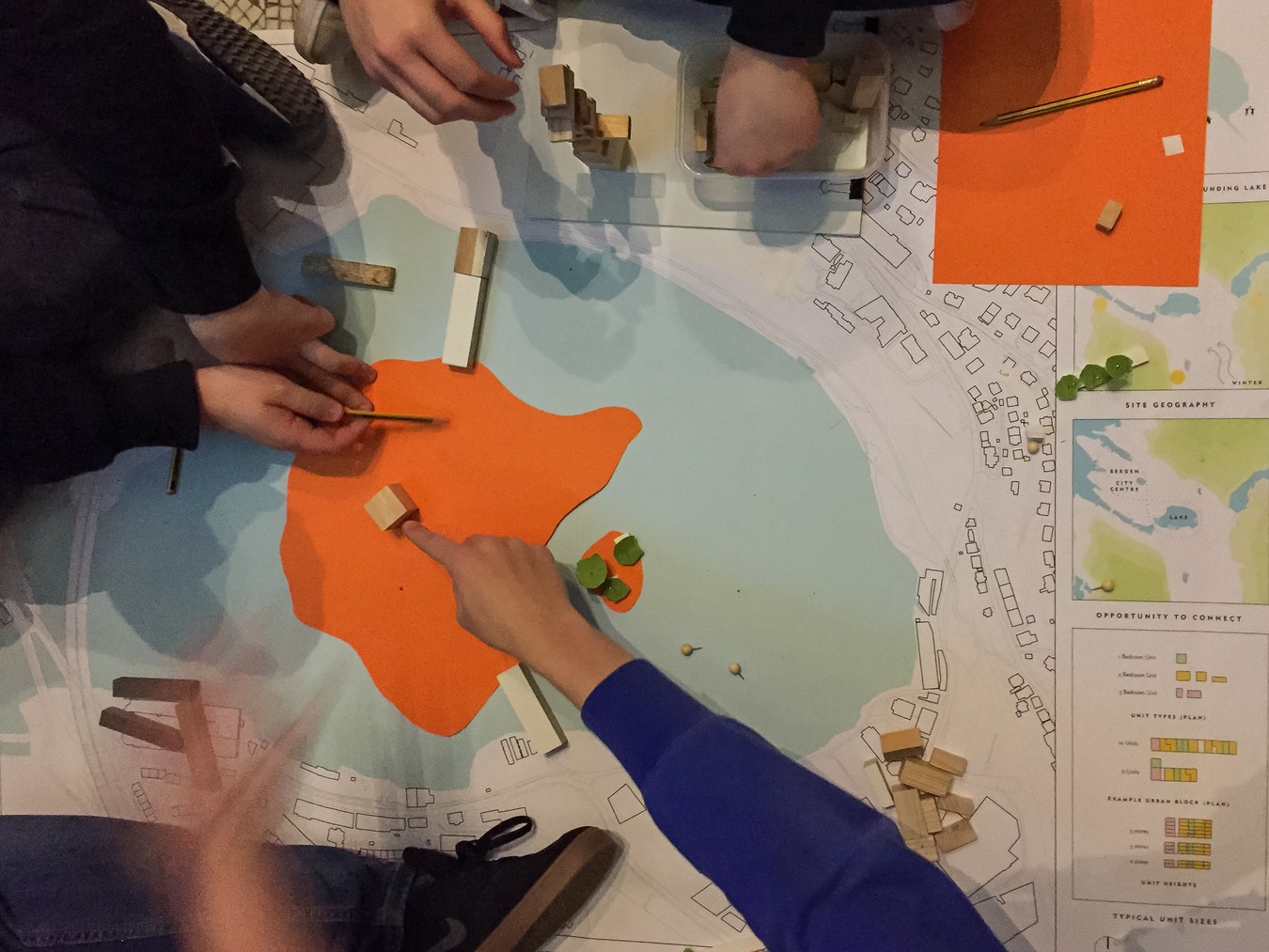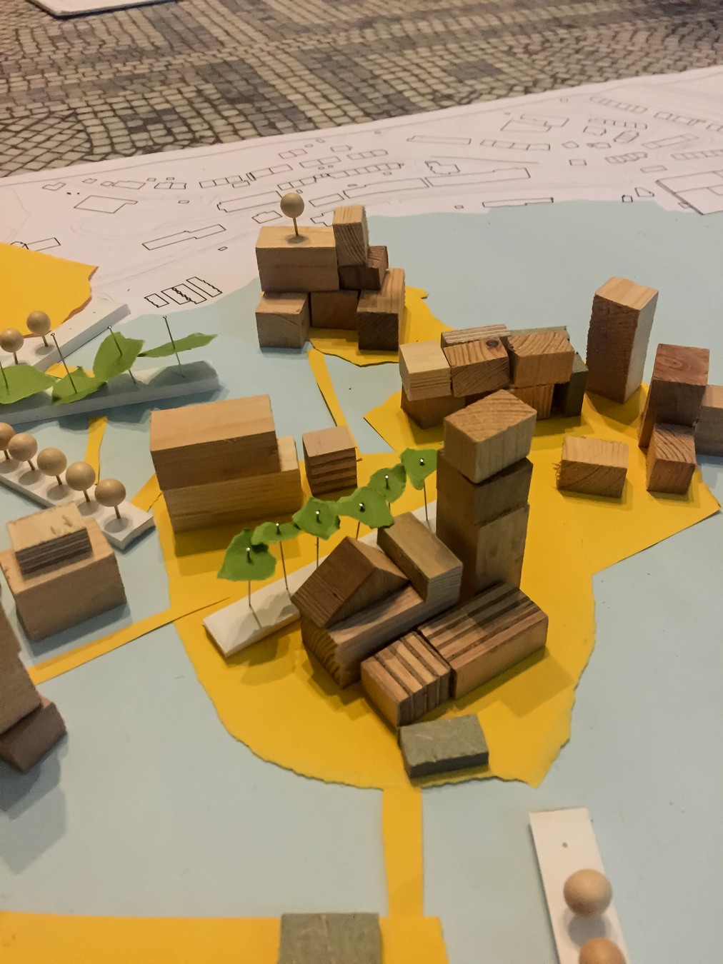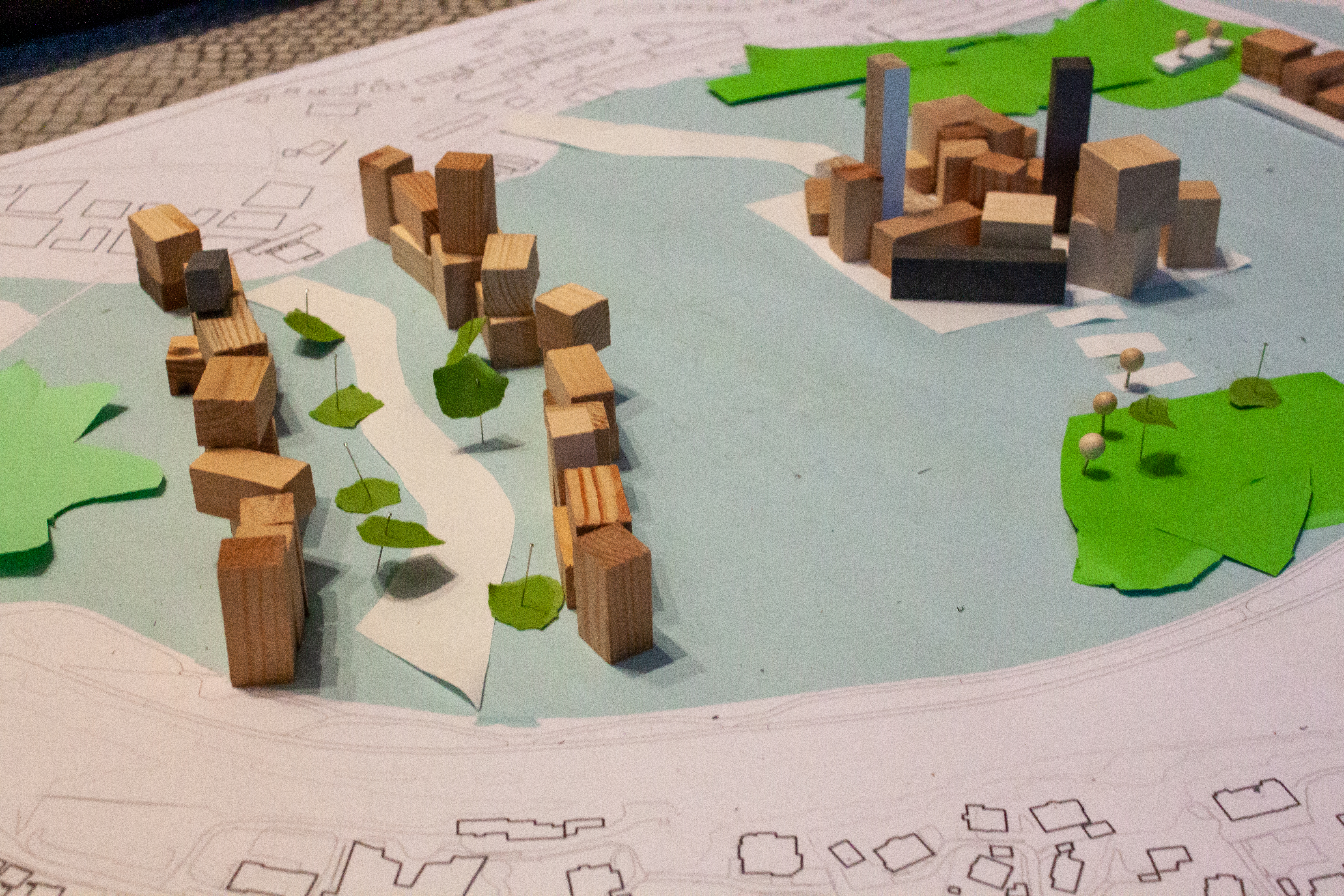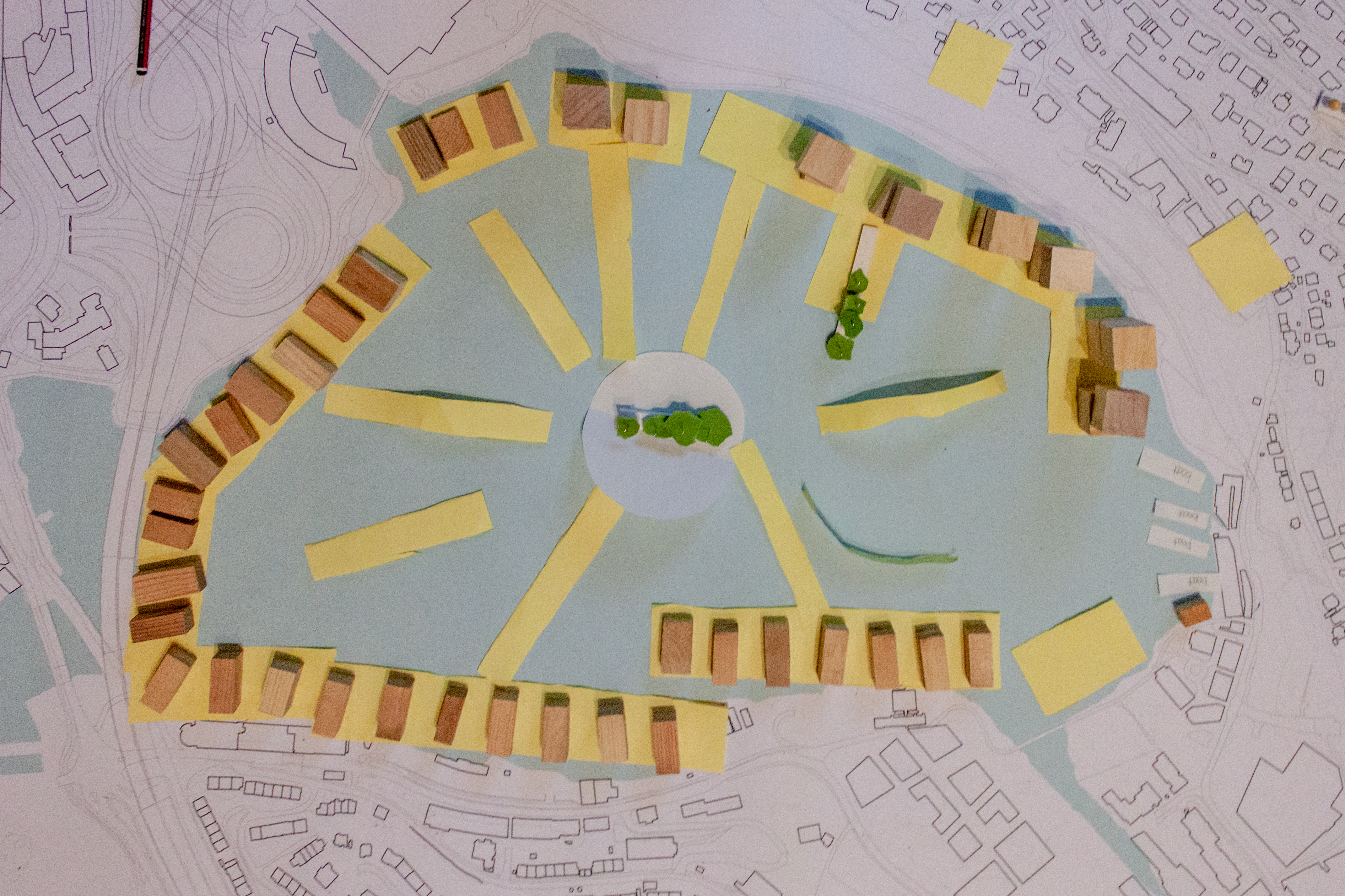 The workshop was based on our project Trenezia in Bergen. Groups of students were tasked with creating an outline for a sustainable village masterplan over the lake using a map, a set of parameters and wooden block offcuts. The were asked for ideas over how the masterplan could be zero carbon and connect to the historic city centre.