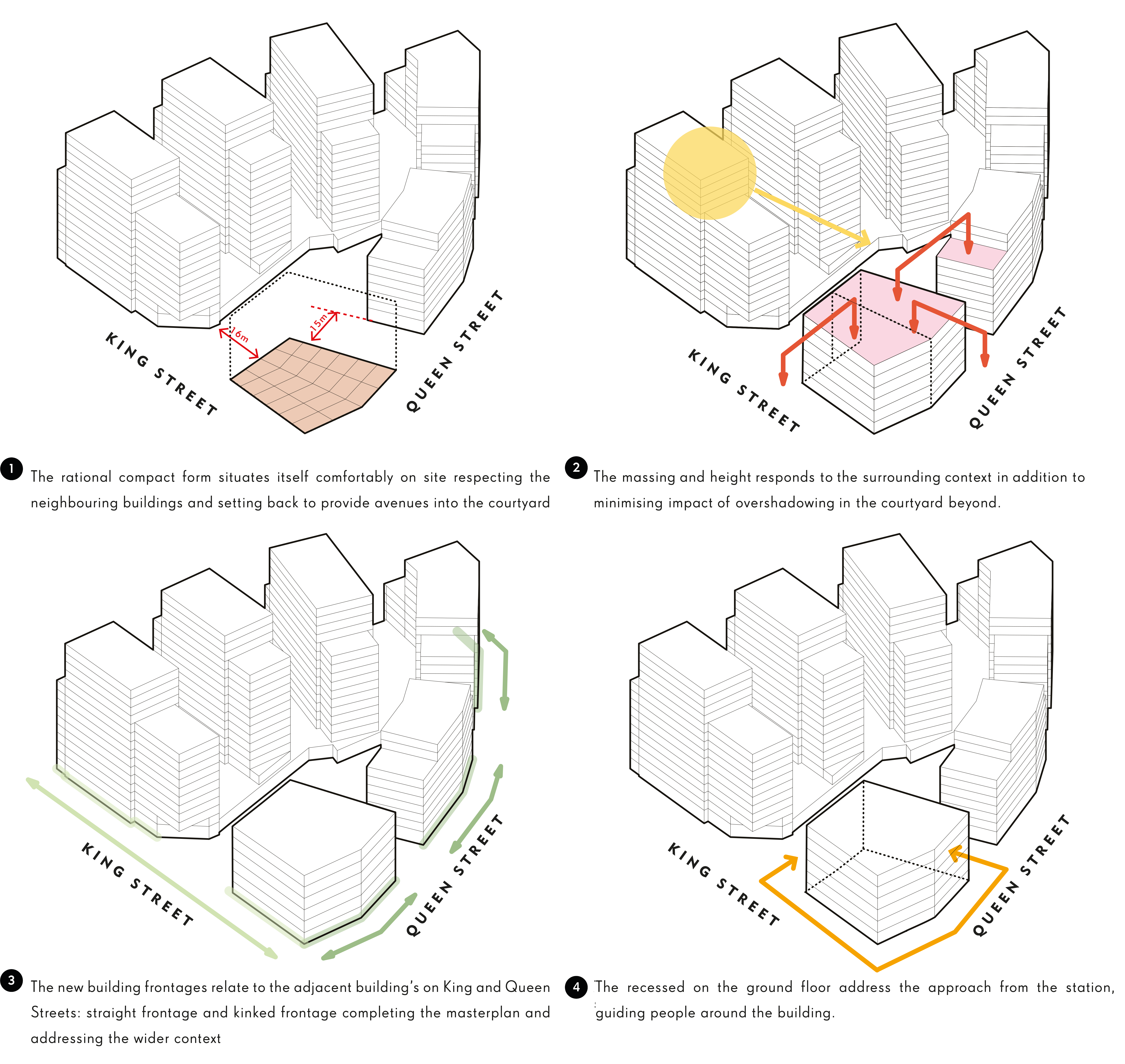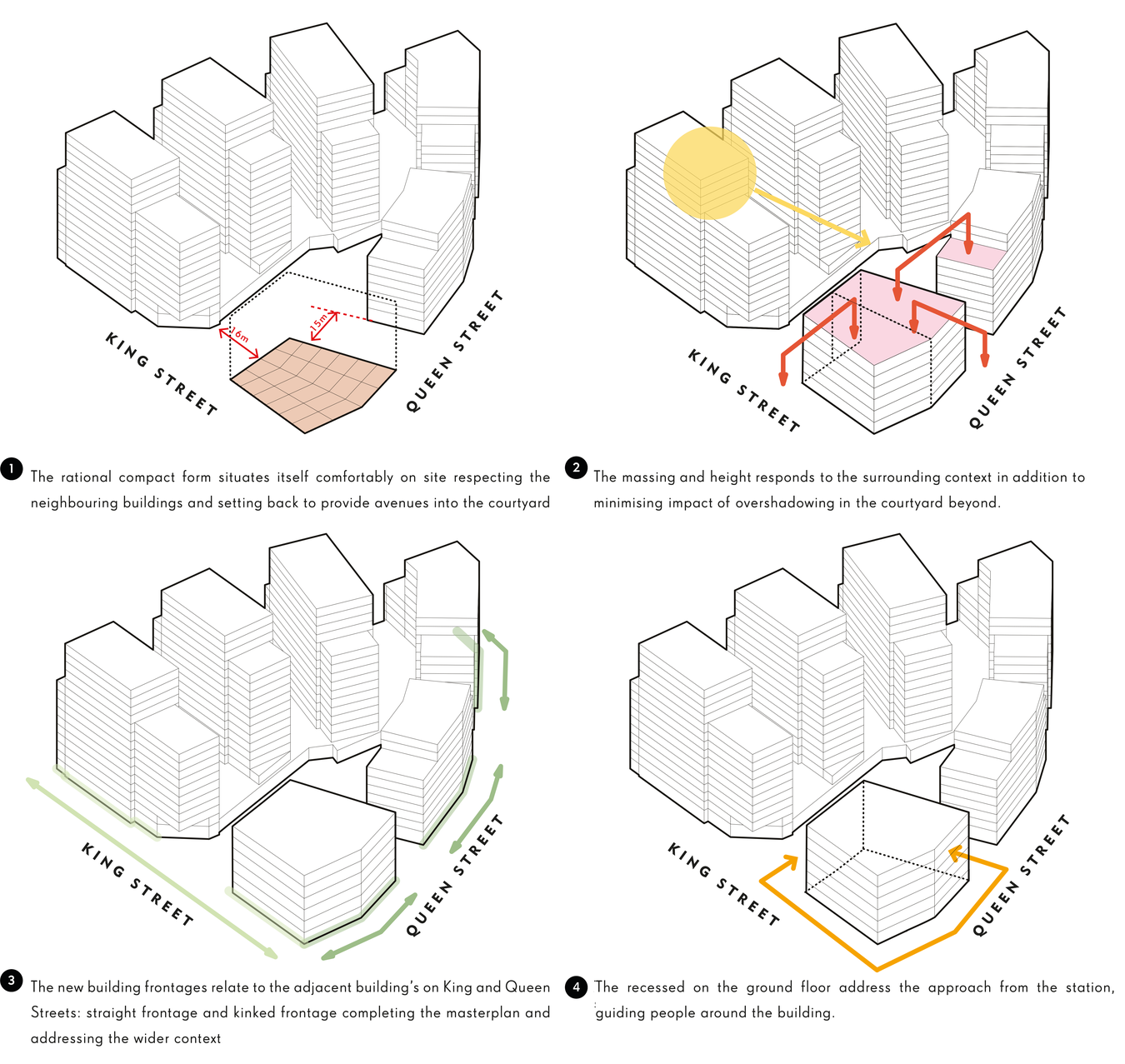 The footprint itself encourages a fluid transition around the building and into the garden from both King Street and Queen Street, while relating to the street frontages along those two prominent routes. Further articulation of the ground floor through the use of colonnades, setbacks and chamfers have been investigated as a means of encouraging pedestrian flows around the building and providing protection from the elements.