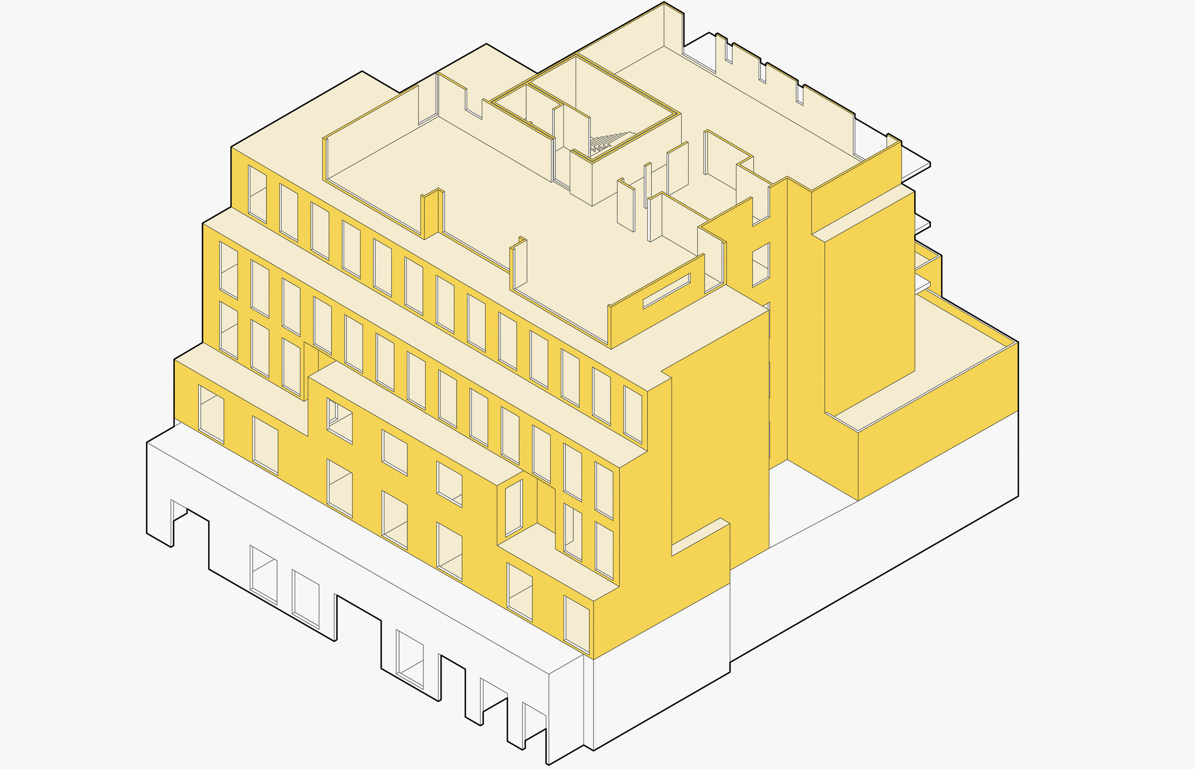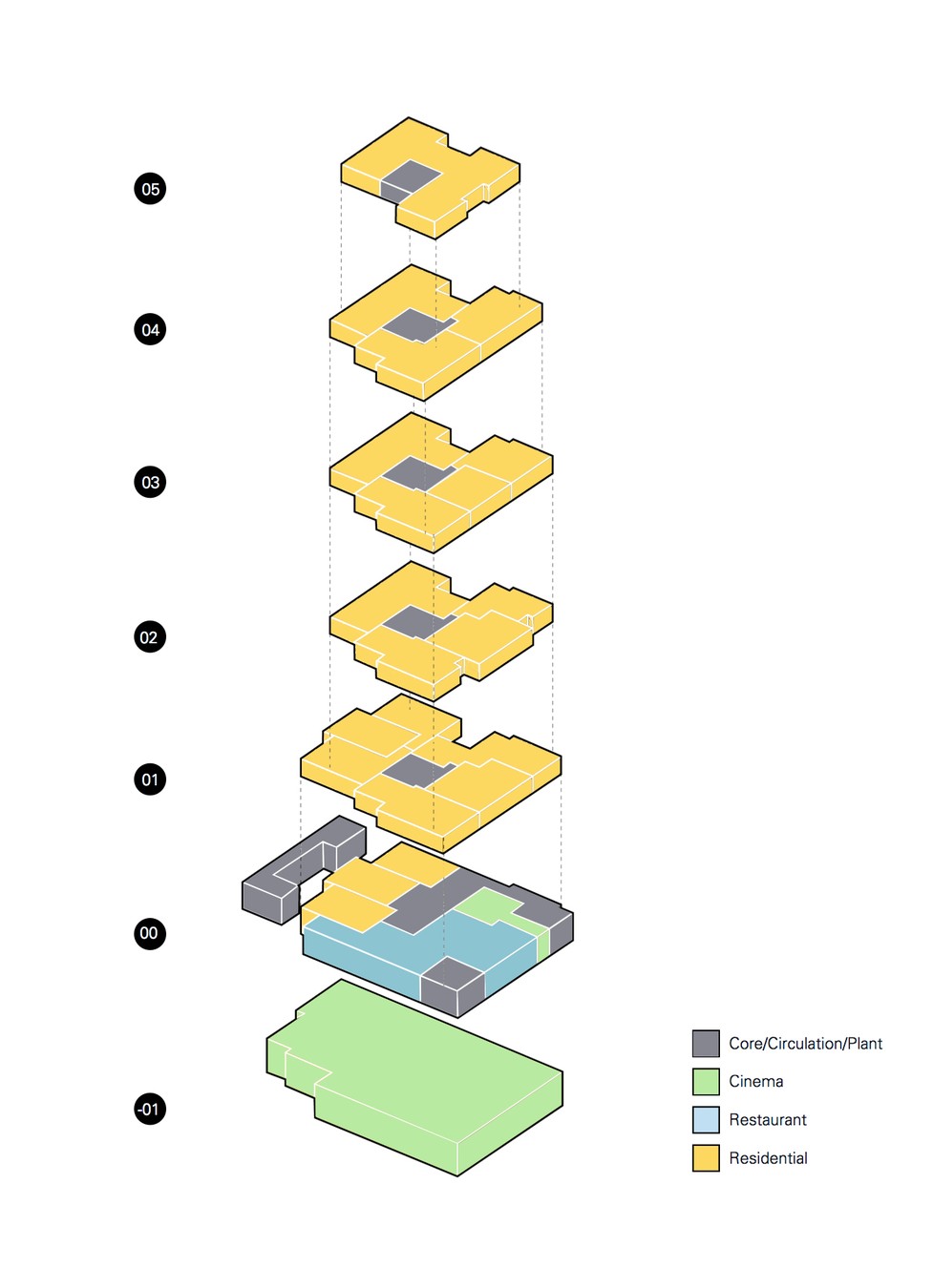 The design consists of two distinct elements, a solid concrete ground level to accommodate the three-screen cinema, and an acoustically insulated CLT upper residential element, with a stepped western elevation providing gardens and balconies. A lightweight zinc-clad pavilion makes a modern extension to the heritage façade whilst minimising the visual impact on neighbouring buildings.