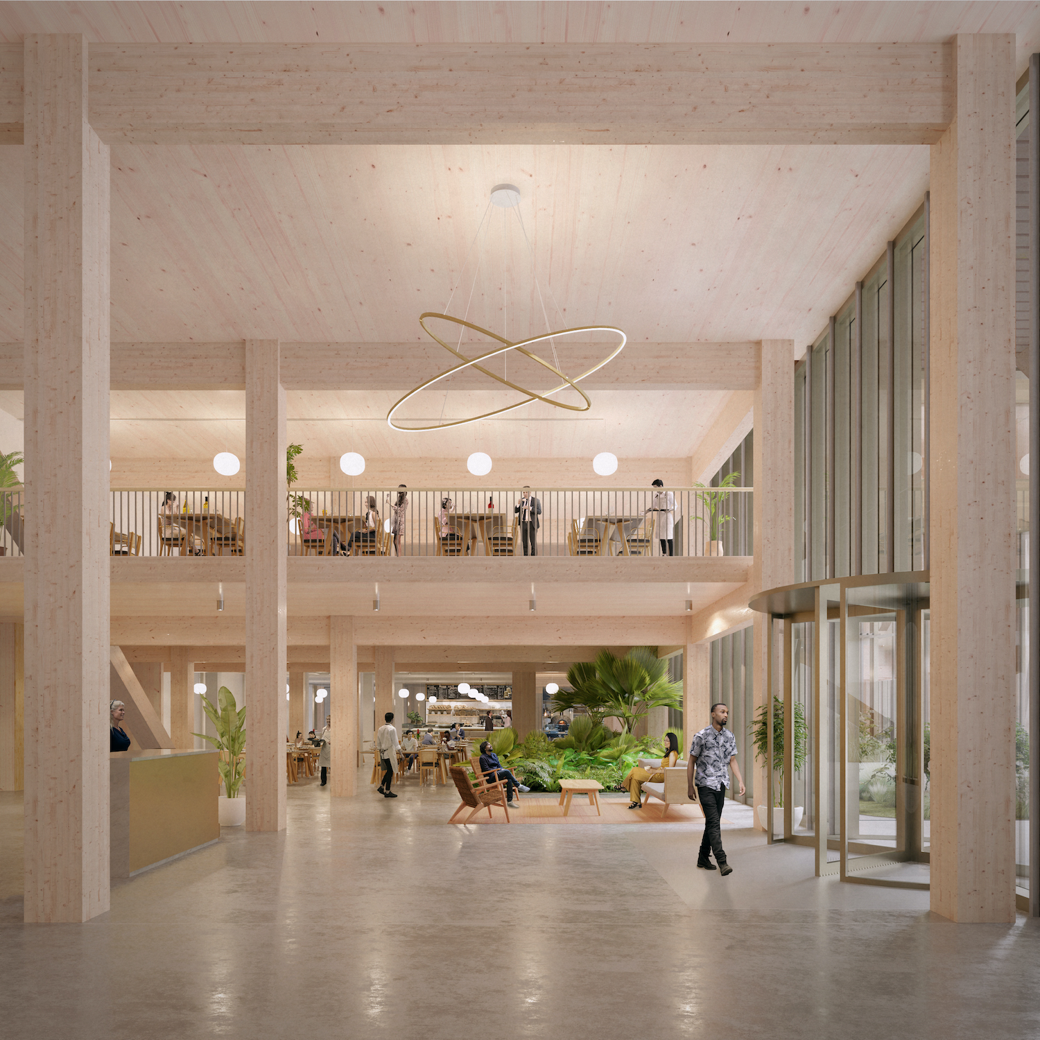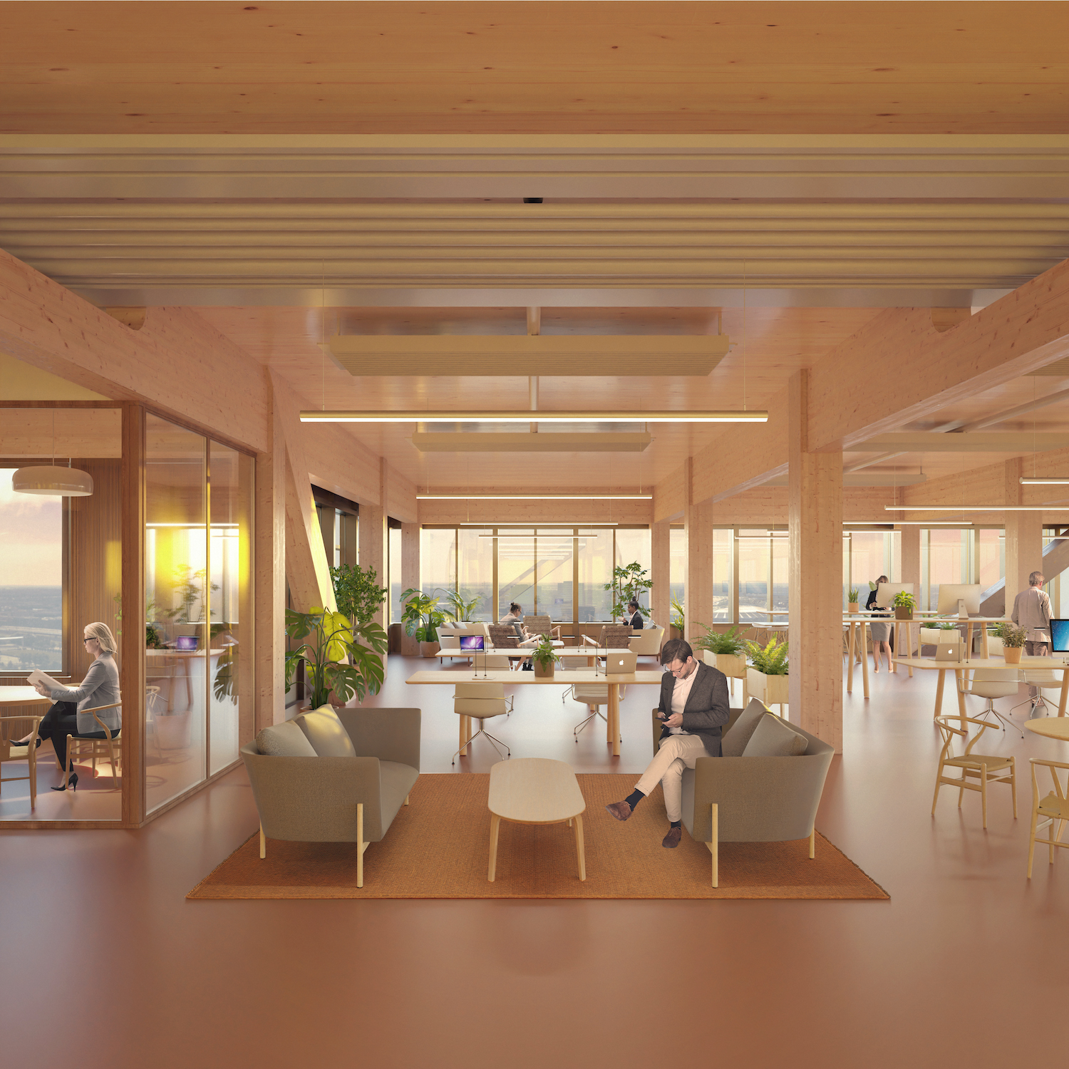 Located within the Amsterdam-Zuidoost area masterplan, Startwell is a landmark building for the future regeneration of the area, benchmarking an aspirational approach to sustainability and the use of mass timber construction. The client's objectives for a holistic, sustainable workplace are woven into the human experience of the building: warm, bright and healthy spaces that have a strong connection to nature and the city.