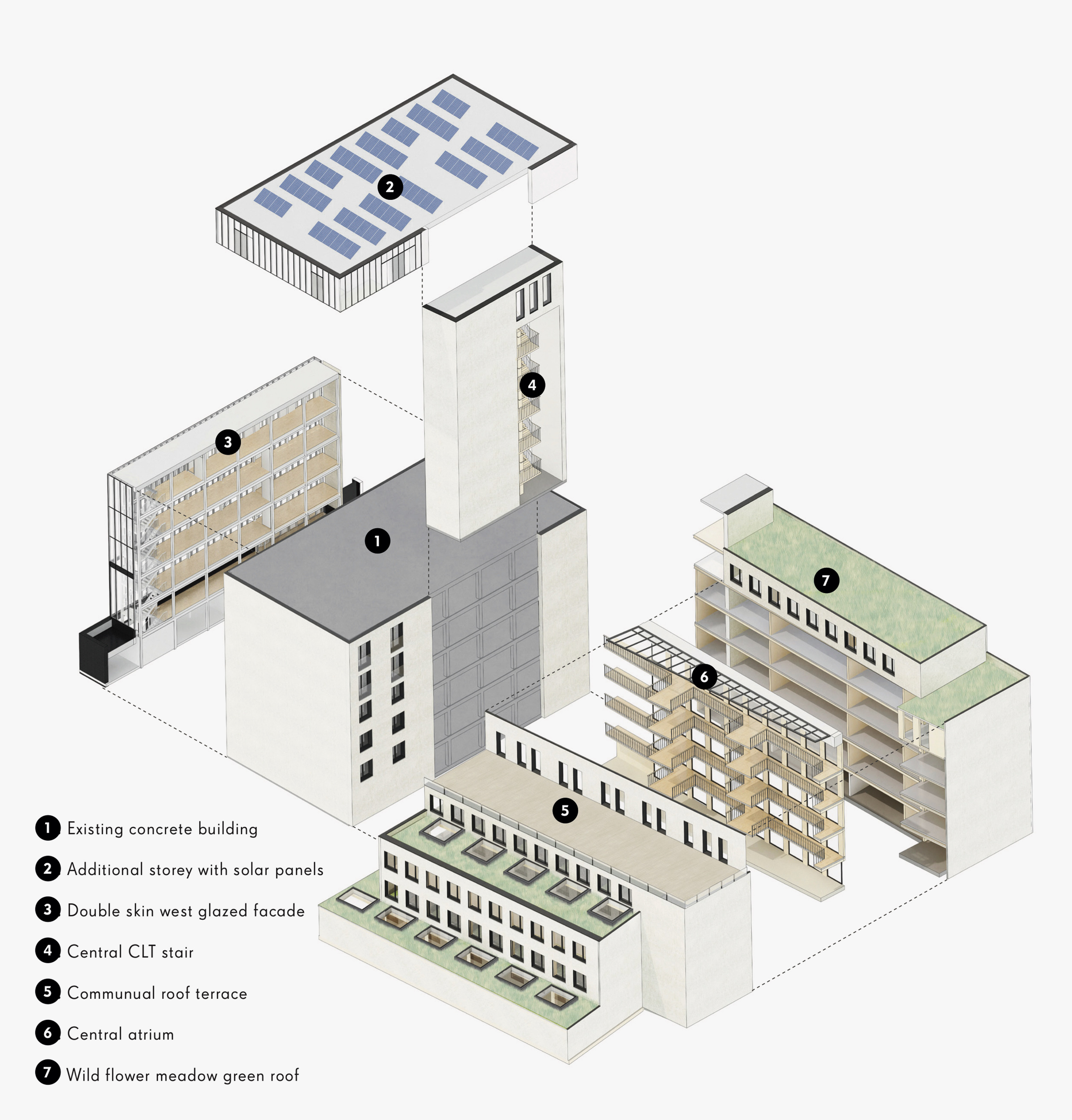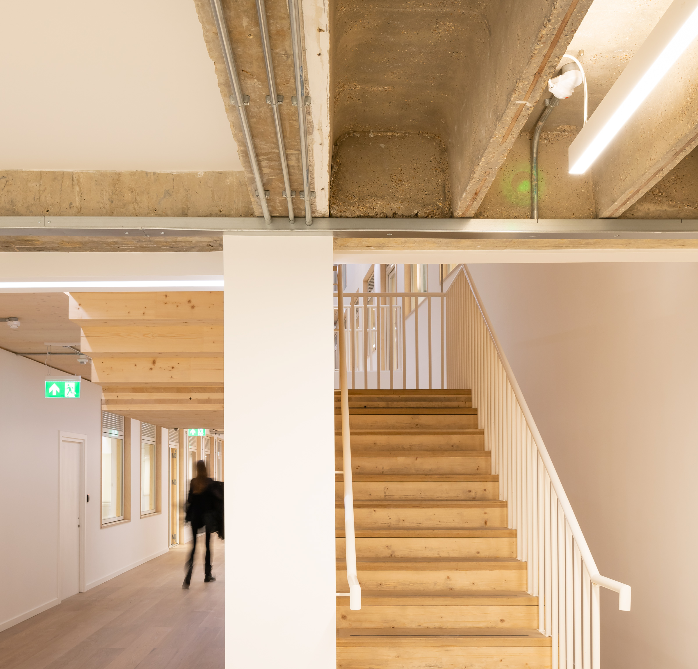 Recycling and refurbishing the existing concrete structure, and taking advantage of its existing thermal mass, we used the low-weight, high-quality structural properties of CLT construction to significantly extend the internal space, increasing it to 50,000 sq ft.