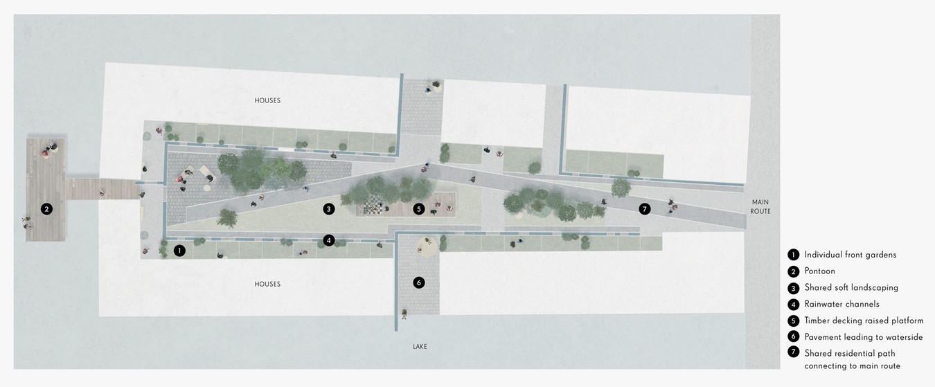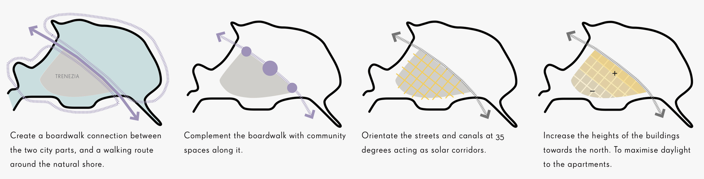 Trenezia is a masterplan that unites these two areas and brings exciting new public spaces to the city. This will be a zero carbon community for all. A new boardwalk spanning the lake forms the central spine of the project; a place for activity and interaction with a swimming pool, sailing club, performance spaces, cafes and shops along its shore.
