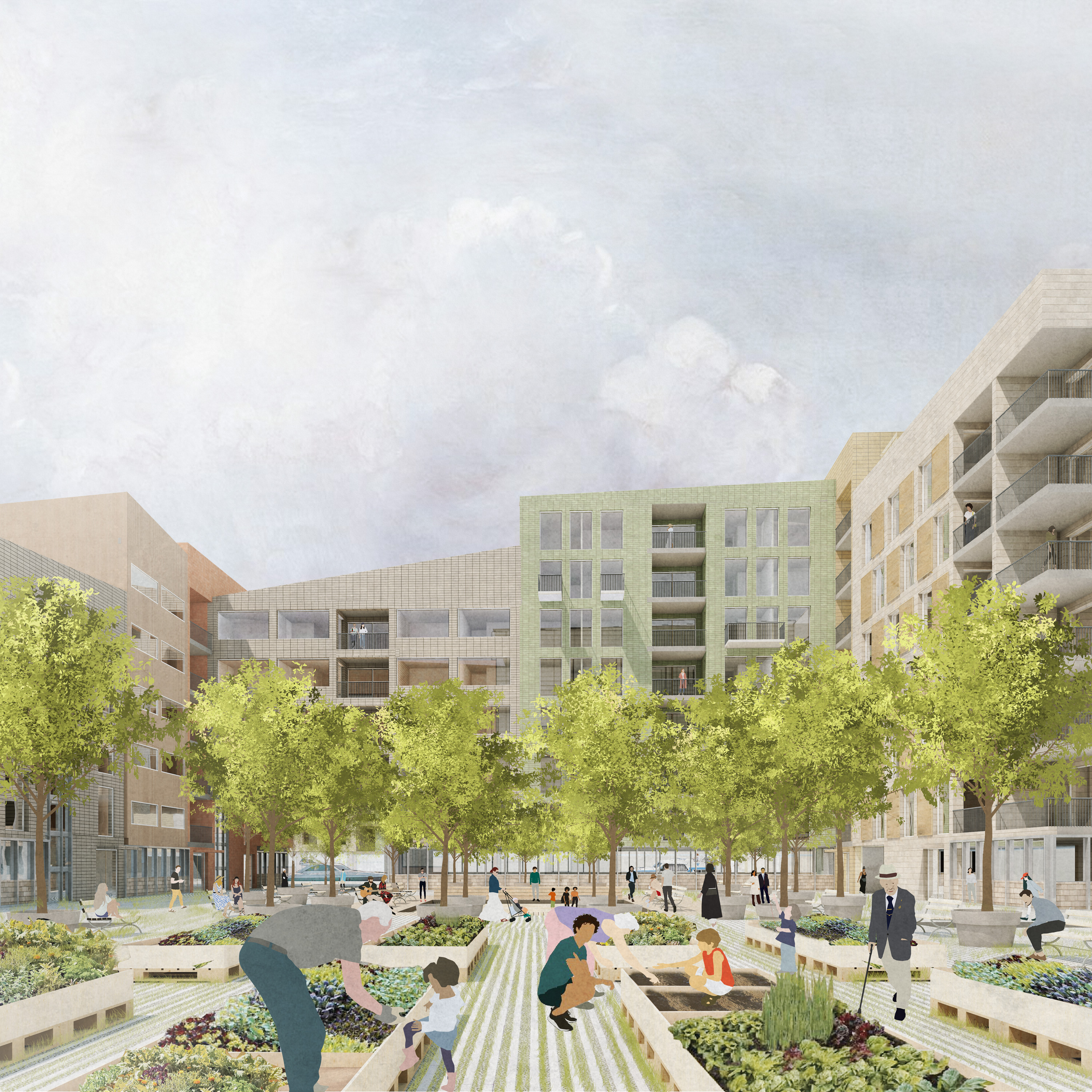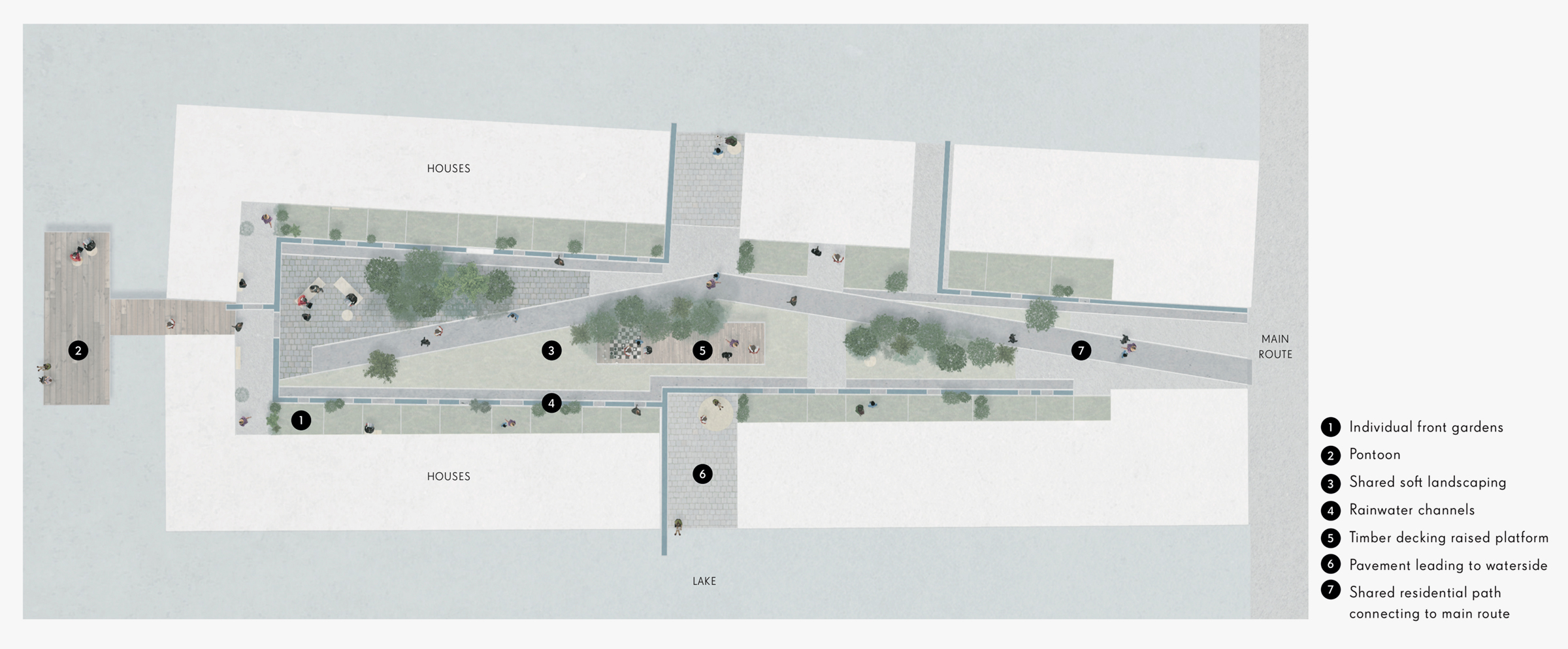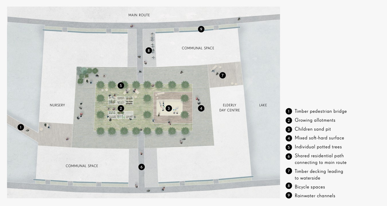 Behind the boardwalk a new residential area offers a diverse range of new homes, catering to the different needs of young families, students and the elderly, creating a space for a new, inter-generational community to establish.