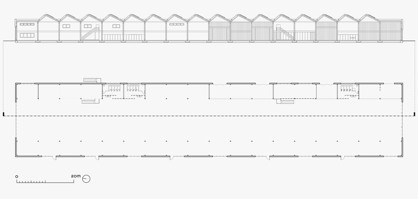Spanning 135 metres in length, 25 metres in width and 6 metres in height, the new HQ and production building is naturally ventilated and naturally lit during daylight hours via its north-facing saw-tooth roof-lights. Prevailing wind provides cross ventilation while the high ceiling height allows heat to rise for comfort in summer.